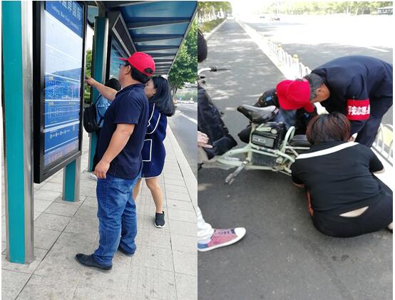 平安志愿者在每一个路口、公交车站维护秩序、为行人服务