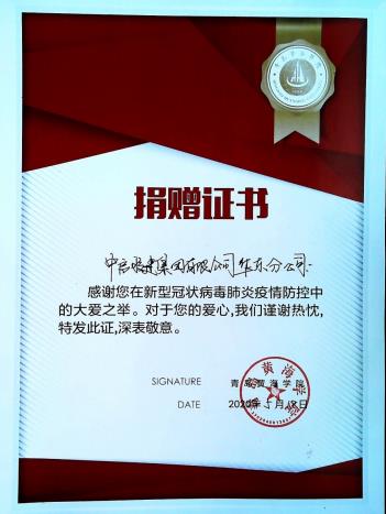 黄海学院基建中心李传江主任及后勤保障部、疫情防控工作领导小组办公室相关领导接受捐赠,对我公司的捐赠表示感谢,并为公司颁发捐赠证书。