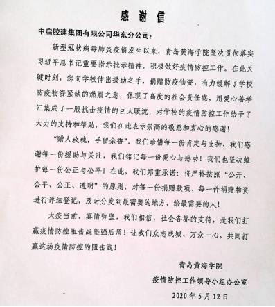 目前,全国疫情得到有效控制,各项生产生活正在积极推进,我市各学校教育系统也按照规定陆续开学。为全面做好学校常态化疫情防控工作,助力学校开学,5月12日,中启胶建集团有限公司华东分公司向青岛黄海学院捐赠医用口罩10500个,84消毒液5桶、医用酒精5桶等一批防疫物资,全力协助黄海学院做好开学前的准备工作。