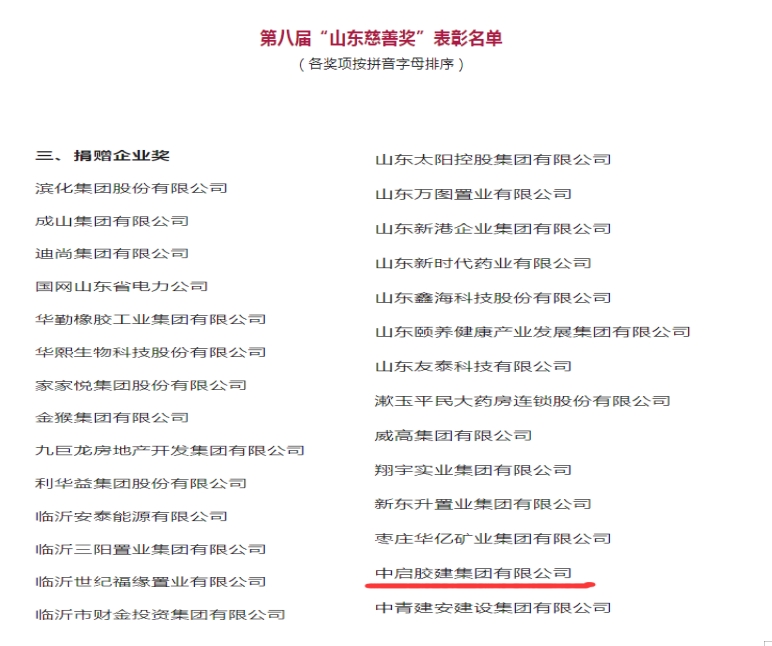 近日,山东省民政厅印发《关于表彰第八届“山东慈善奖”获得者的决定》,对2020年10月至2022年12月期间在山东省慈善领域作出突出贡献的先进典型予以表彰,授予100个爱心个人、爱心团队、捐赠企业、慈善项目第八届“山东慈善奖”。其中,慈善楷模10个、捐赠个人13个、捐赠企业51个、慈善项目26个。中启胶建集团有限公司荣获第八届“山东慈善奖”爱心捐赠企业。“山东慈善奖”是山东省慈善领域政府最高奖。