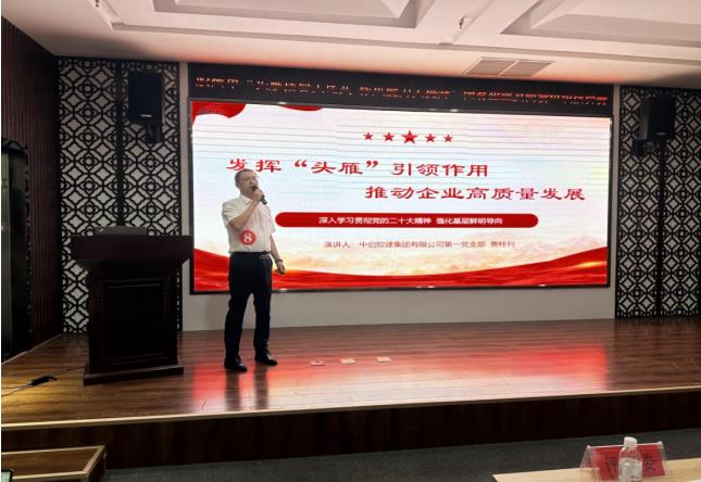 擂台赛上,中启胶建集团第一党支部书记贾桂刊演讲主题是《发挥“头雁”引领作用 推动企业高质量发展》,讲述党建工作深入基层、深入项目工地,大力开展“干一个工程,树一座丰碑”党建品牌创建活动,在企业建设中积极发挥思想引导、政治引领作用,为推动企业实现高质量发展奠定坚实基础。