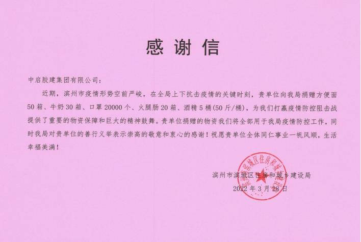 聚合青春正能量,务实笃行显担当----中启胶建集团青岛公司防疫工作获赠锦旗
