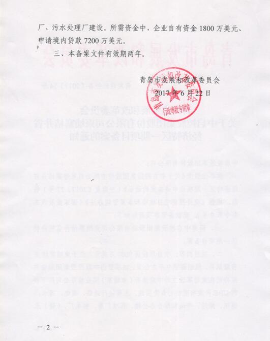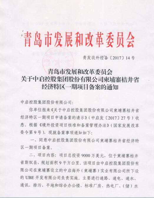 2017年6月22日,柬埔寨桔井省经济特区项目获得青岛市发改委备案。这是项目继2014年11月取得商务部企业境外投资证书后,获得的又一项重要手续,表示该项目全面获得中国境内合法手续。