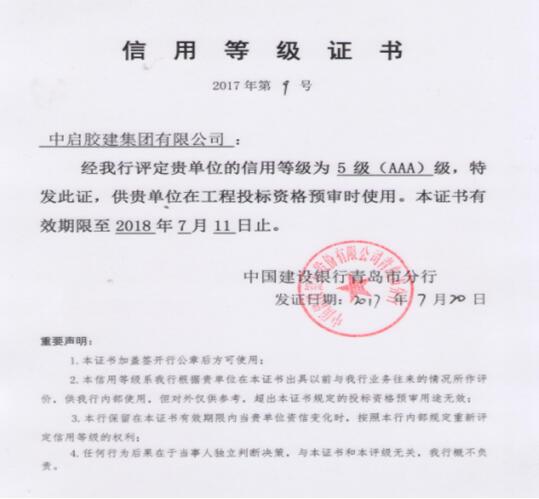 近日,中启胶建集团有限公司顺利通过中国建设银行信用等级aaa复评工作,此次复评主要考核企业在银行的信誉情况。