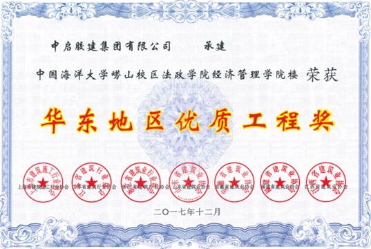 中国海洋大学崂山校区法政学院经济管理学院楼,2015年顺利通过“泰山杯”验收,以优良的工程质量、精美的细部处理获得验收组专家及各级领导的一致好评,由此被评选获得“华东地区优质工程奖”。