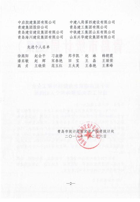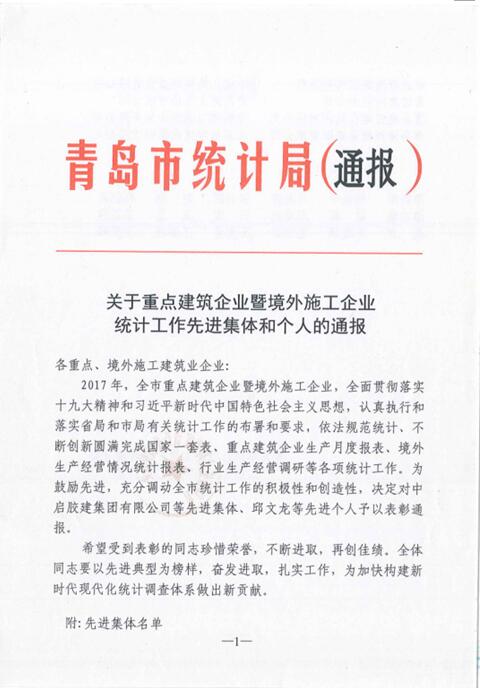 2017年公司全面贯彻落实十九大精神和习近平新时代中国特色社会主义思想,认真执行和落实山东省统计局和青岛市统计局有关统计工作的部署和要求,依法规范统计、不断创新,圆满完成国家一套表、重点建筑企业生产月度报表、境外生产经营情况统计报表、行业生产经营调研等各项统计工作。荣获青岛市重点建筑业暨境外施工企业“统计工作先进集体”称号。