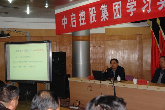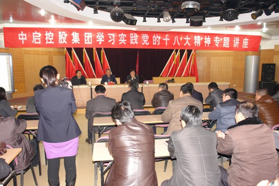 2014年1月11日下午,中启控股集团在集团二楼多功能厅举办以“学习实践党的十八大精神”为主题的专题讲座,特别邀请了胶州市宣讲团成员、宣传部副部长王清臣,就十八大精神作了专题讲授。集团党委副书记邢吉忠主持讲座,党委书记、董事局主席张启荣、常务副总裁郭道盛、副总裁张桂香等领导及各公司机关管理人员、所属单位中层以上人员听取讲座。