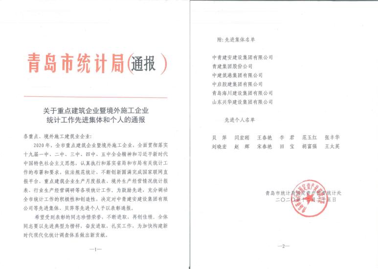 2020年,公司全面贯彻落实十九届一中、二中、三中、四中、五中全会精神和习近平新时代中国特色社会主义思想,认真执行和落实省局和市局有关统计工作的部署和要求,依法规范统计、不断创新圆满完成国家一套表、重点建筑企业生产月度报表、境外生产经营情况统计报表、行业生产经营调研等各项统计工作。荣获青岛市重点建筑业暨境外施工企业“统计工作先进集体”荣誉称号。