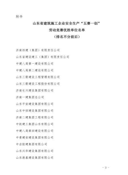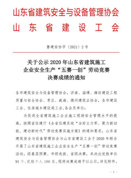 近日,山东省建筑安全与设备管理协会、山东省建设工会下发了《关于公示2020年山东省建筑施工企业安全生产“五赛一创”劳动竞赛决赛成绩的通知》,我公司经过预赛、市级选拨、省级决赛,成功荣获“山东省建筑施工企业安全生产‘五赛一创’劳动竞赛优胜单位”称号。