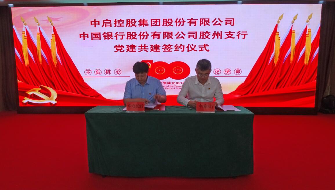 接着中启控股集团与中国银行胶州支行举行了党建共建签约仪式,双方将通过党建共建,实现资源共享、优势互补、共同提高。