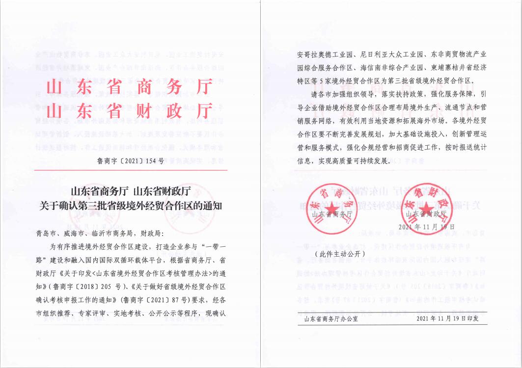 2021年11月19日,根据《山东省商务厅、山东省财政厅关于确认第三批省级境外经贸合作区的通知》(鲁商字﹝2021﹞154号),柬埔寨桔井省经济特区确认为第三批省级境外经贸合作区。