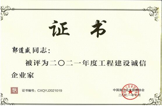近日,中国施工管理协会发布了《关于公布2021年度工程建设诚信企业家评价结果的通知》,中启胶建集团总经理郭道盛获评“2021年度全国工程建设诚信企业家”。