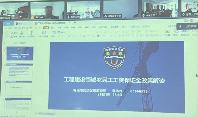 2月21日,公司邀请青岛市劳动监察保障局蒋海龙科长对工程建设领域如何缴纳农民工工资保证金进行指导培训。培训方式通过线上腾讯会议进行,培训人数达200多人。会议由集团公司安全生产管理部统一组织,在中启大厦20楼会议室及各分公司分别建立分会场,公司安全生产管理部全体人员、计财管理部相关人员,各分公司主管经理、劳务主管、财务相关人员及项目经理、项目会计、劳资管理员参加了此次培训。