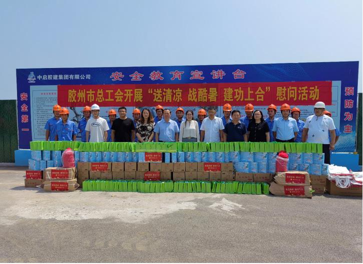 8月3日上午,胶州市总工会党组书记、常务副主席孙勇,权益保障部部长张其森,办公室副主任谭延华到公司承建的青岛幼儿师范高等专科学校项目开展“送清凉、战酷暑 建功上合”慰问活动,集团董事、副总裁王法精,工会主席刘博及建设单位付容云校长等相关领导陪同参加了慰问活动。