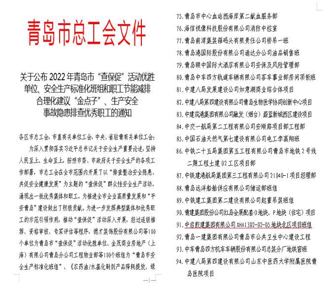近日,青岛市总工会公布了2022年度“查保促”活动先进集体和先进个人名单,其中,中启胶建集团有限公司被授予青岛市“查保促”活动优胜单位称号;中启胶建集团限公司xha1302-02-05地块北区项目班组被授予青岛市安全生产标准化班组称号。