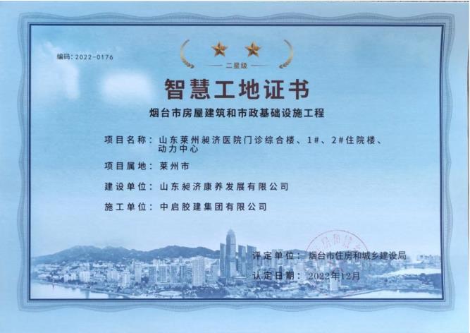 近日,由集团建筑二分公司承建的山东莱州昶济医院门诊综合楼、1#、2#住院楼、动力中心项目荣获“烟台市建筑施工二星级智慧工地”,充分展现公司的建设实力、科技实力以及自主创新实力,在烟台市建筑业企业中起到引领示范作用。