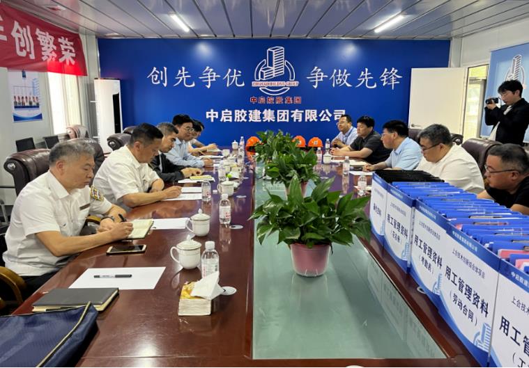 2023年5月25日下午,青岛市根治拖欠农民工工资工作领导小组办公室主任,市人力资源和社会保障局党组成员、副局长辛广军带队一行7人,在胶州市委常委、统战部部长、副市长董如增及相关部门负责同志的陪同下,到公司及项目走访调研。中启控股集团党委书记、总裁、中启胶建集团董事长张增昌,中启胶建集团副总经理刘尧及相关人员陪同调研。