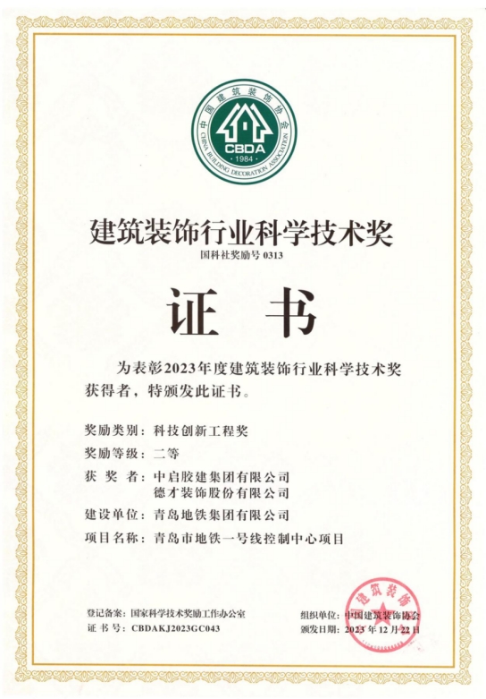 12月15日,中国建筑装饰协会公布了2023年度中国建筑装饰行业科学技术奖获奖名单。由中启胶建集团建设的青岛市地铁一号线控制中心项目荣获中国建筑装饰行业科学技术奖(科技创新工程奖)二等奖。这是公司首次获得该奖项,创中启胶建集团技术创新领域的先河。