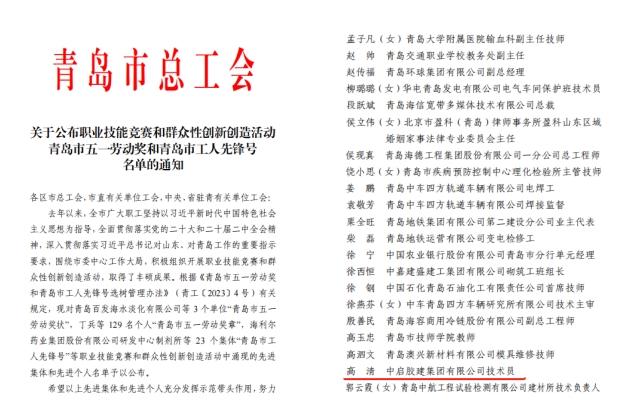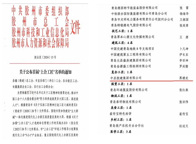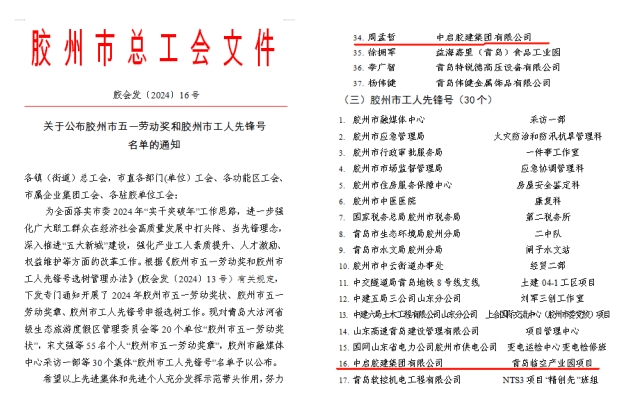 值此“五一”国际劳动节来临之际,4月29日上午,胶州市庆祝“五一”国际劳动节大会暨胶州市总工会第十三届委员会第二次全体会议在市会议中心四楼多功能厅召开。会上表彰了2024年胶州市获得各级荣誉的先进集体和个人。集团斩获多项殊荣,集团黑增武同志荣获“首届上合工匠”荣誉称号,高清同志荣获“青岛工匠”和“青岛市五一劳动奖章”荣誉称号,周孟哲同志荣获“胶州市五一劳动奖章”荣誉称号,青岛临空产业园项目班组荣获“胶州市工人先锋号”称号。