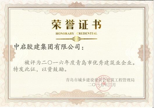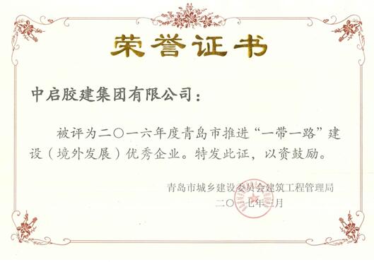 近日,青岛市建委建管局表彰2016年度建筑行业优秀企业。中启胶建集团荣获青岛优秀建筑业企业、青岛市推进"一带一路"建设(境外发展)优秀企业两项殊荣。这是企业综合实力提升和参与国家一带一路建设取得显著业绩的缩影。中启胶建集团将以此为契机,再接再厉,加强企业市场主体信用考核,提升企业综合竞争力,全力参与国家一带一路建设,不断创造更加丰硕的成果。