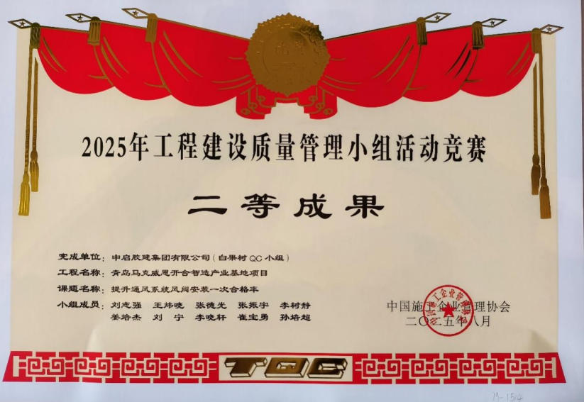 中启胶建集团青岛公司发布的qc成果“提升通风系统风阀安装一次合格率”荣获中施企协2025年工程建设质量管理小组活动竞赛二等成果。