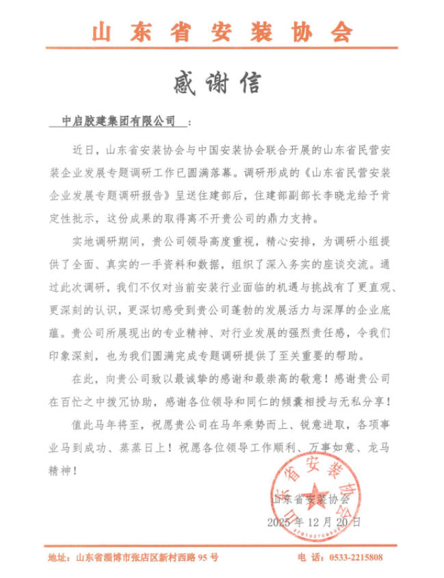 近日,集团收到山东省安装协会发来的感谢信,对我司在山东省民营安装企业发展专题调研中的鼎力支持致以诚挚感谢与崇高敬意。